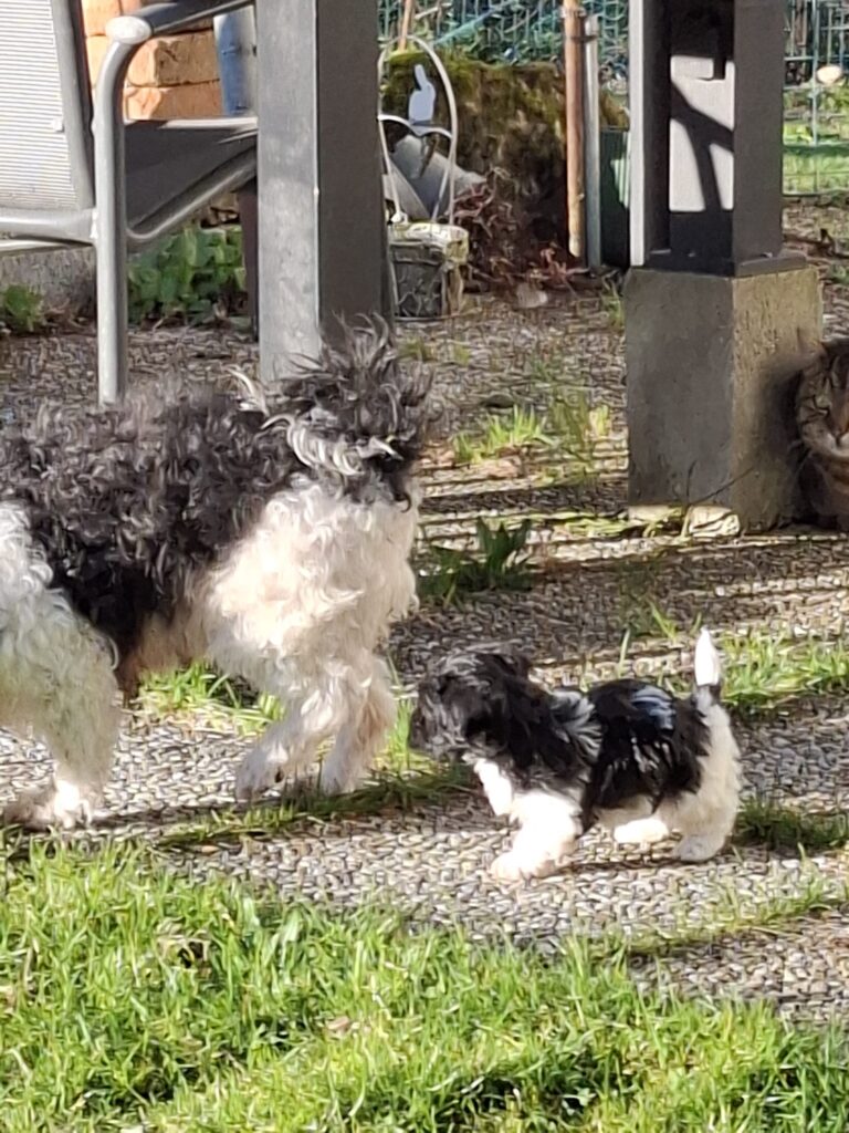 Anfang März haben wir entzückenden, reinrassigen Havaneser Nachwuchs bekommen!  Zwei wundervoll gezeichnete Welpen, eine entzückende  Prinzessin und einen Prachtjungen hat uns unsere Havie Dame geschenkt!  Die Fellknäuelchen sind bereits sehr mutig und mit viel Entdeckerdrang unterwegs. Die beiden beginnen die Welt der Zwei- und Vierbeiner, und bei schönem Frühlingwetter, auch den Garten zu erkunden. Heute haben sie auch unsere Katzen Maxi und Minnie kennengelernt, eine ganz neue Erfahrung für die zwei!