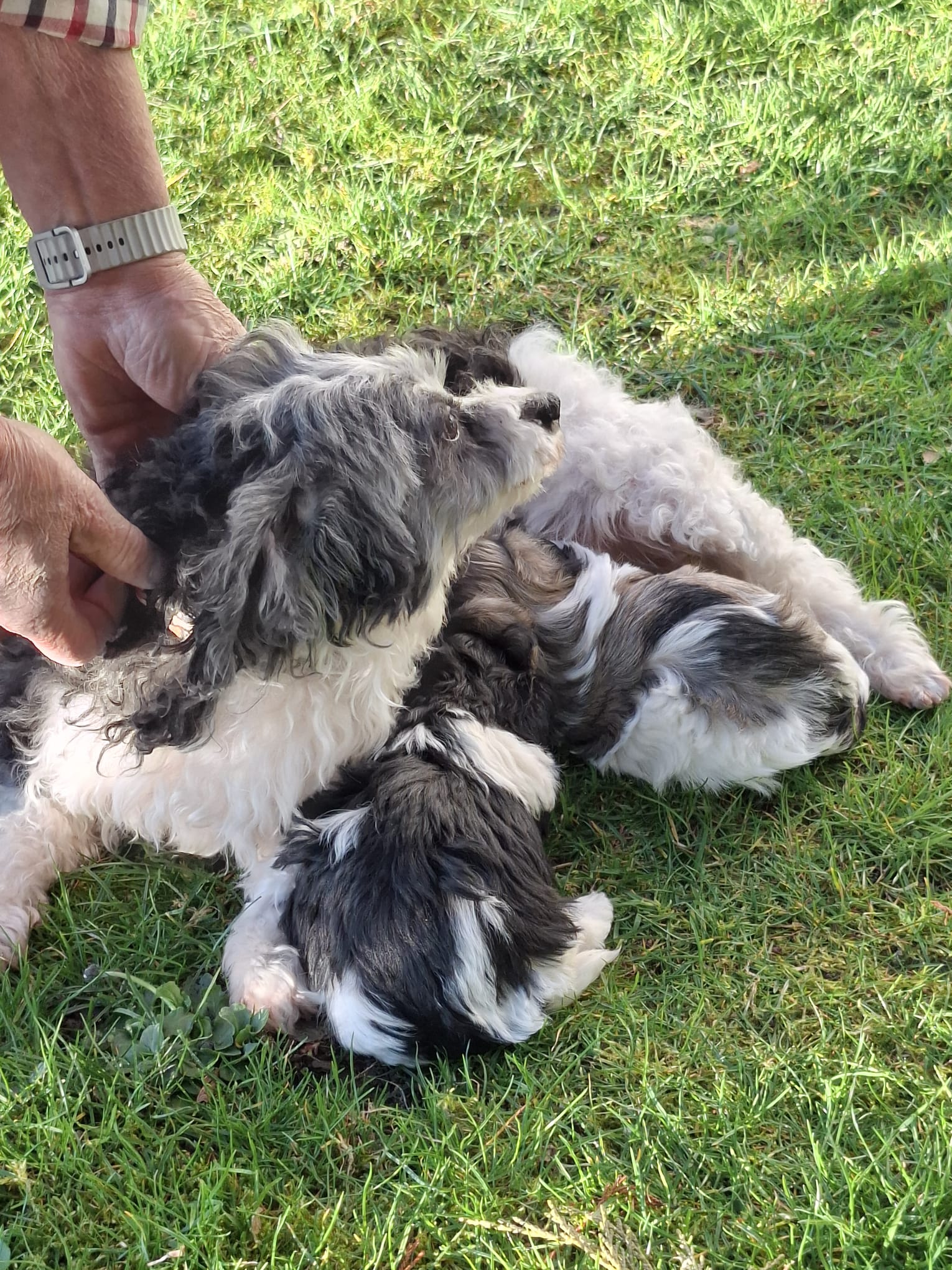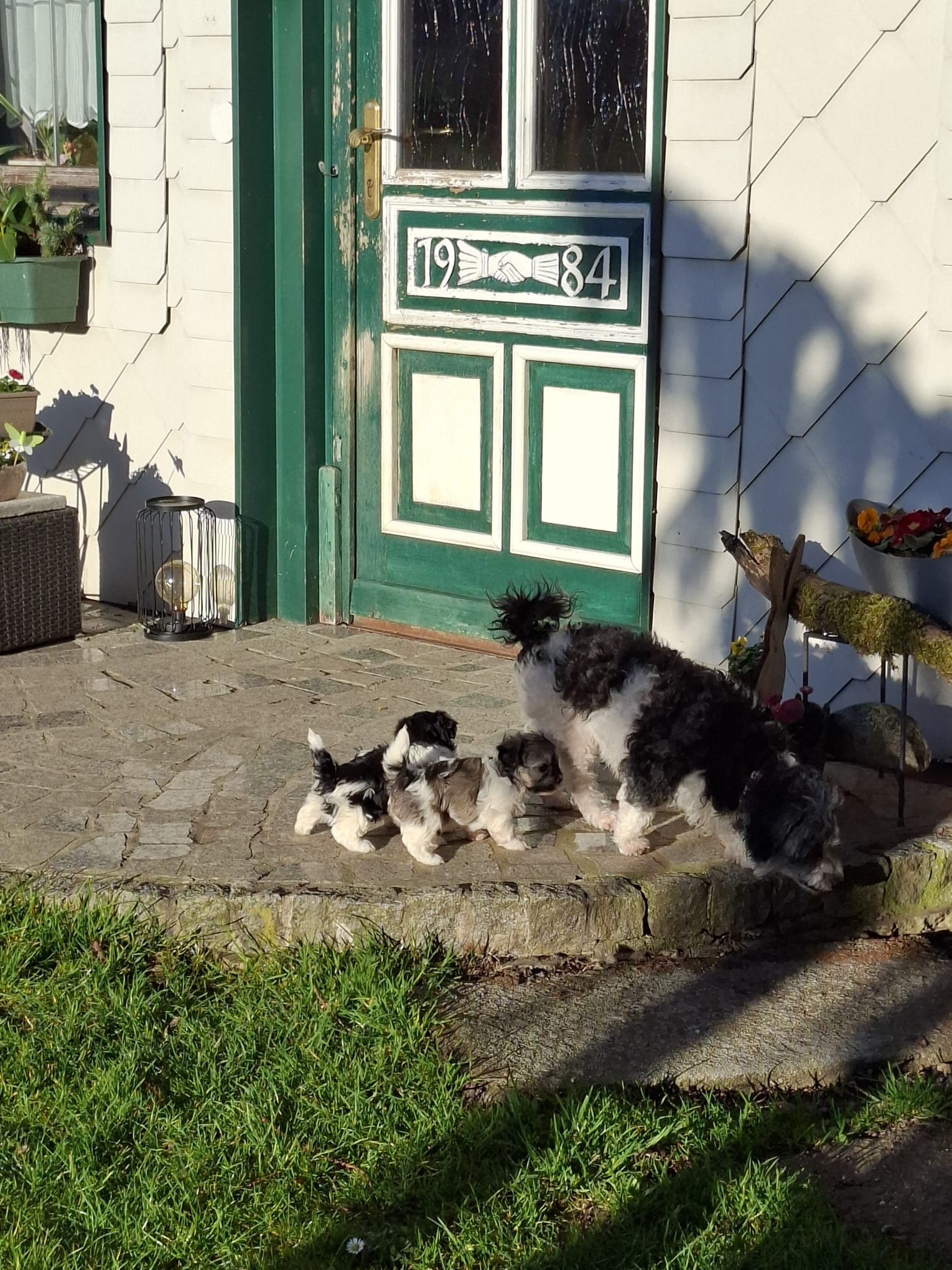 Alle, Welpen und Eltern sind bestens in unseren Familienalltag integriert, machen uns nur ganz viel Freude. Das Aufwachsen mitzuerleben ist wundervoll, vom winzigen Baby bis jetzt, die Entwicklung mitzuerleben bereichert auch unser eigenes Leben.